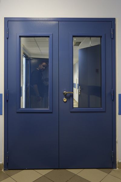 Противопожарная алюминиевая дверь синего цвета в Дзержинском